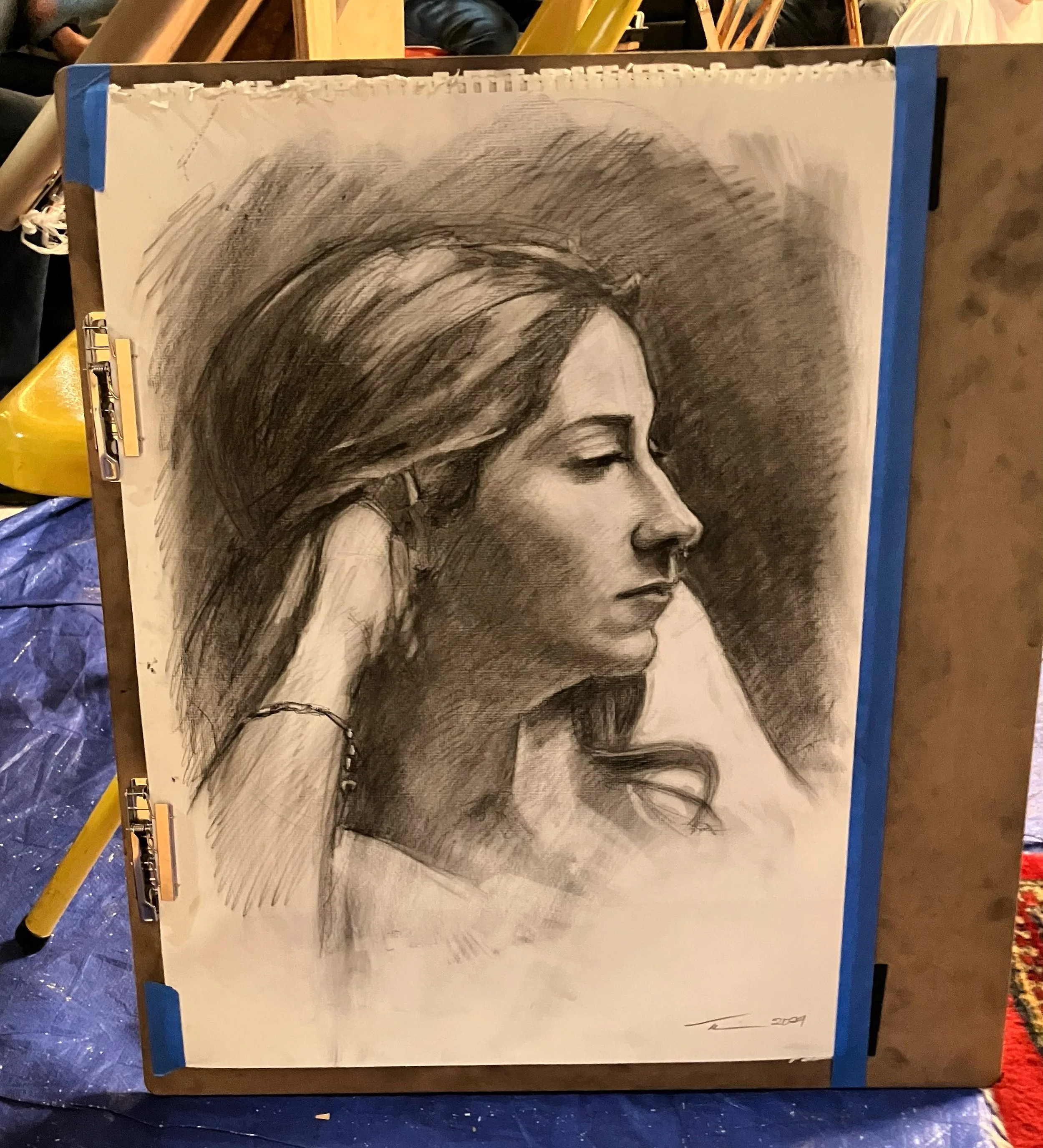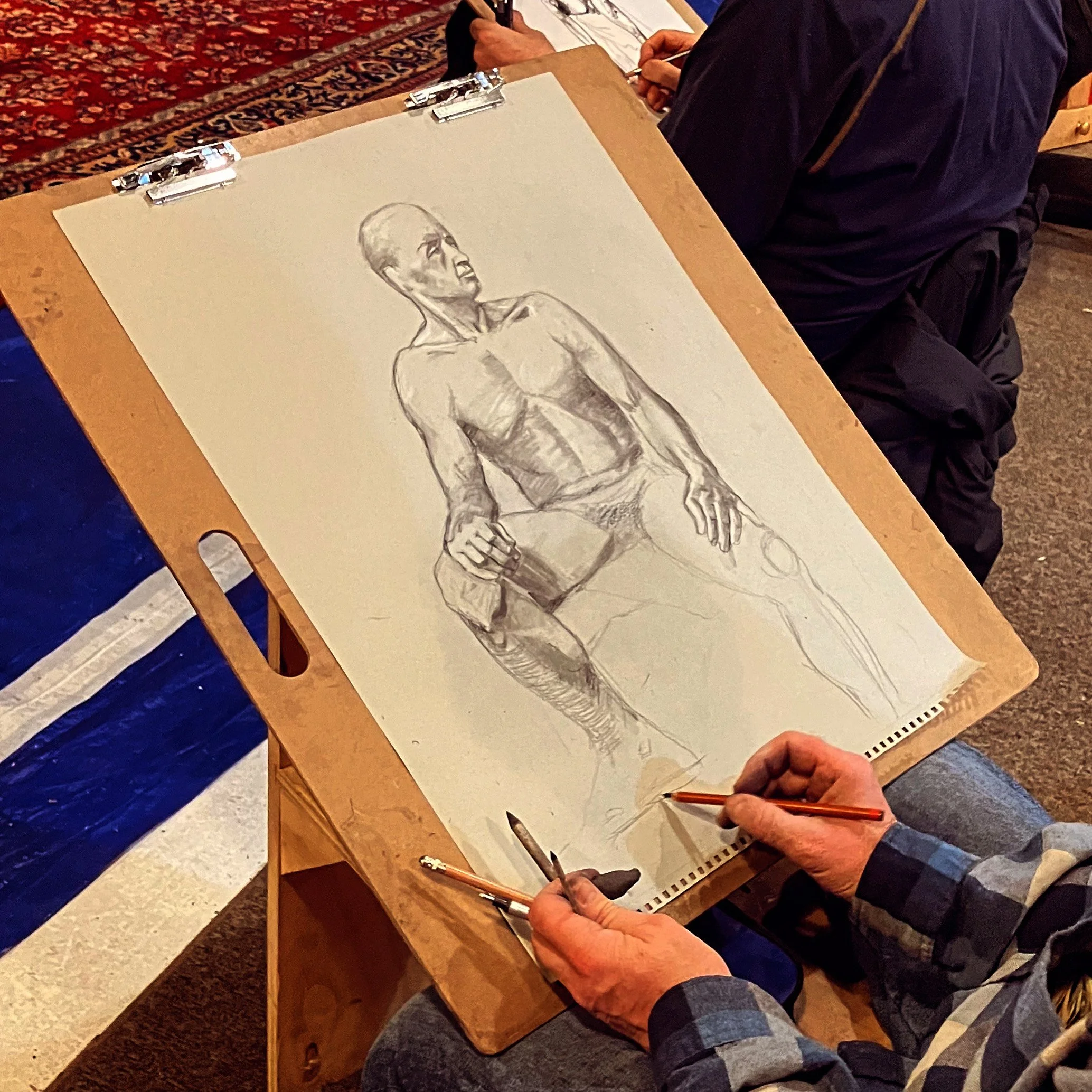 There is a warm-up of (5) 2-minute poses and (2) 5-minute poses, this is followed by (2) 10-minute poses and (1) 60-minute pose, with the possibility of one more finishing pose before the end of the evening.
